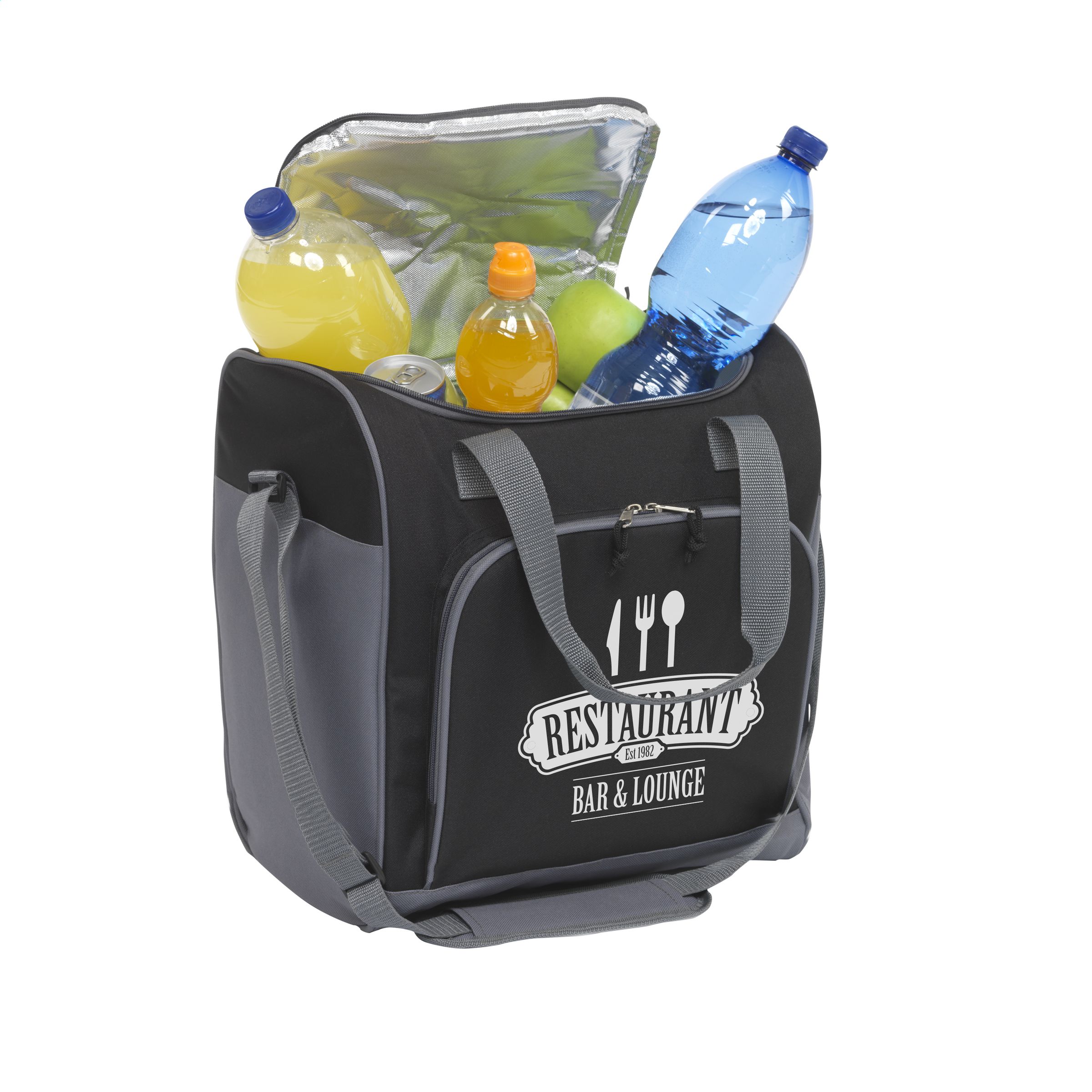 Handig formaat koeltas van geweven 600D polyester. Met ruim koelvak, ritsvak aan de voorzijde, handgreep en verstelbare schouderriem.